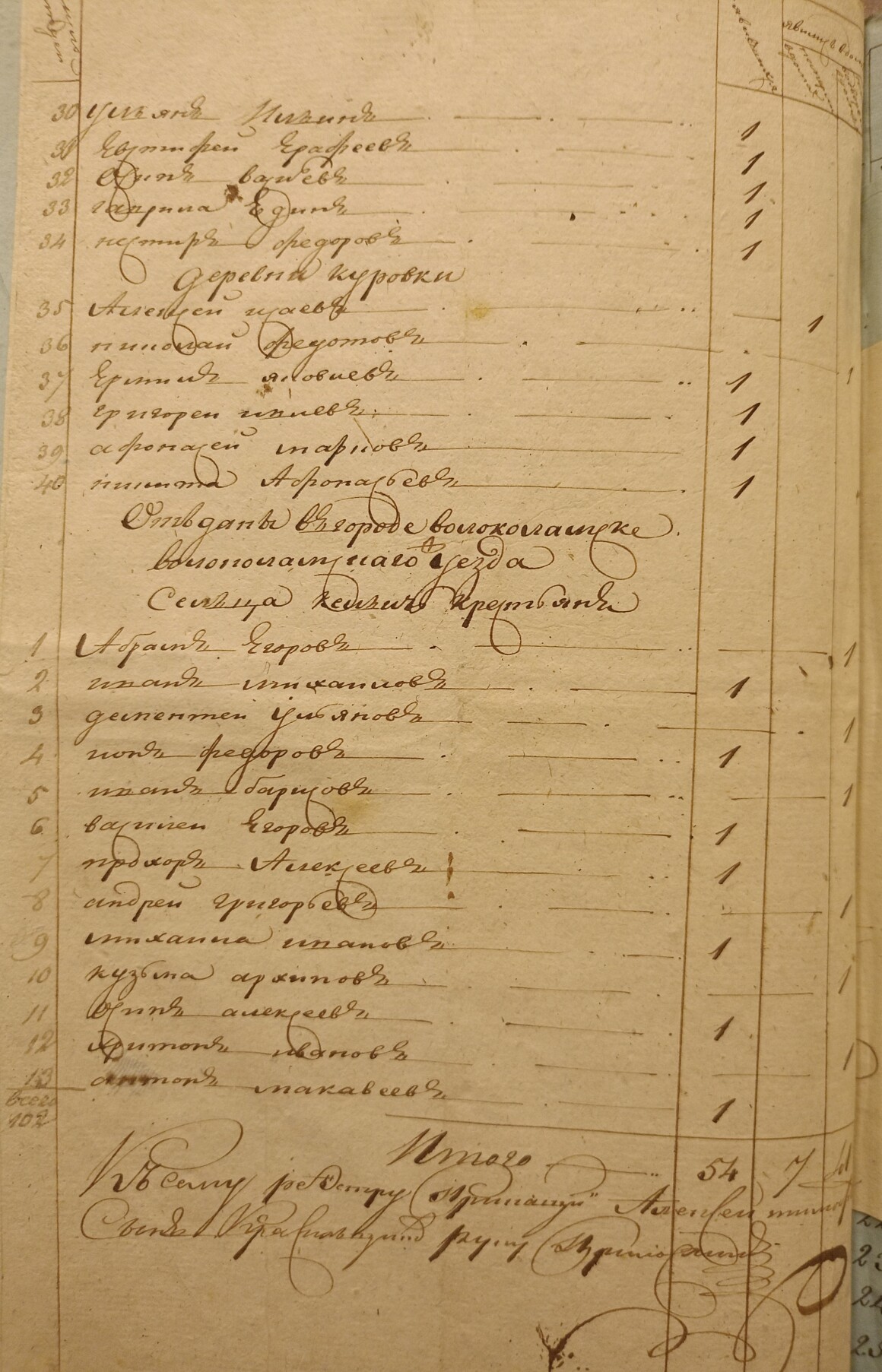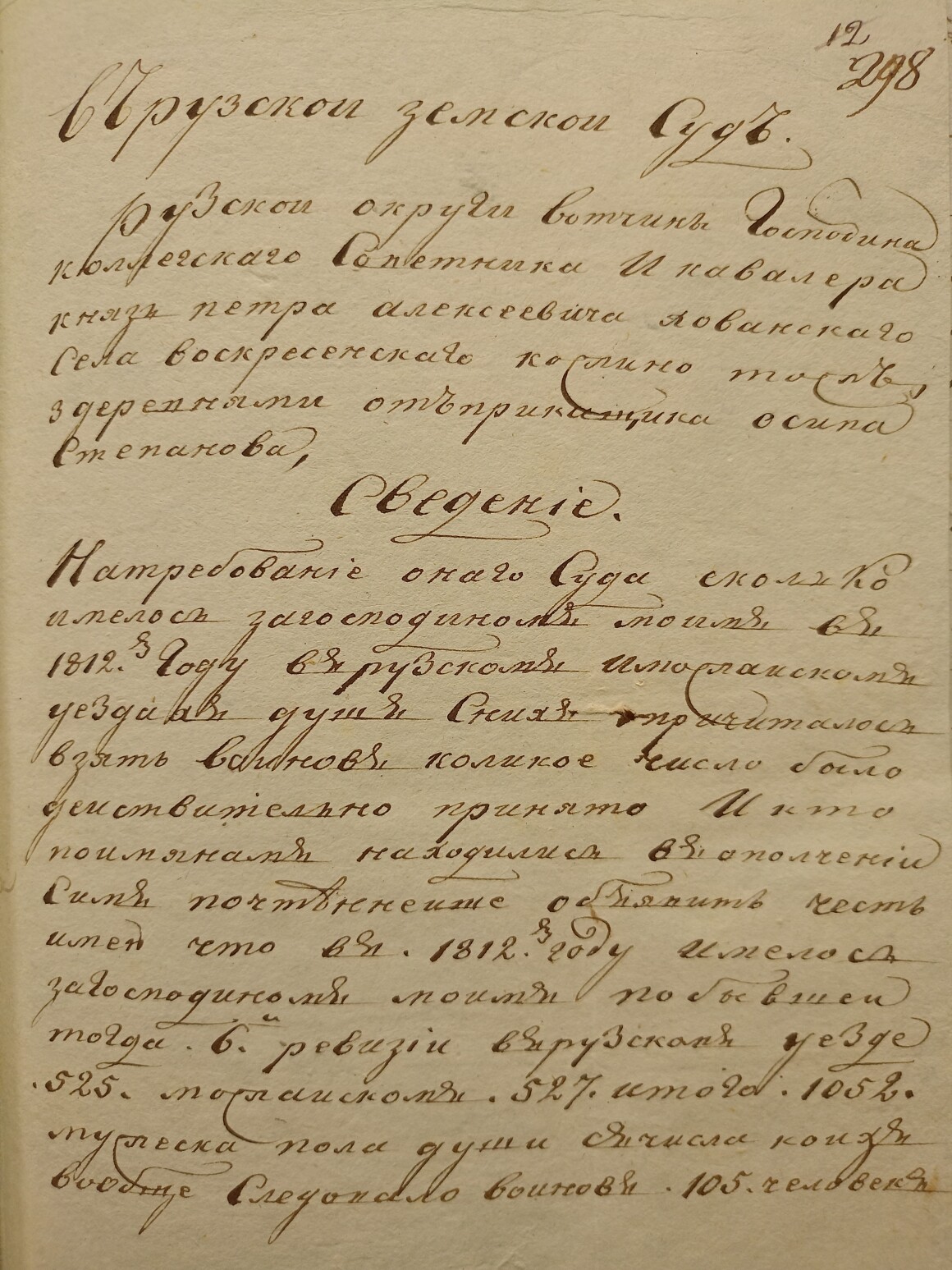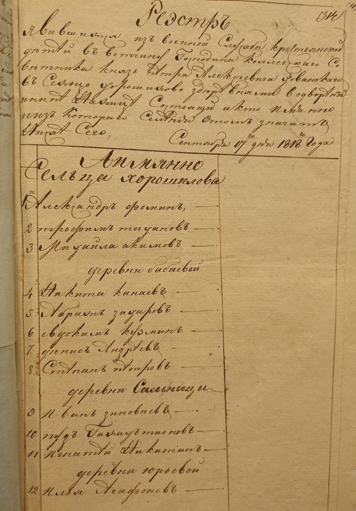 Ведомость именная Рузской округи села Горбова церкви Казанской Пресвятой Богородицы о прихожанах священника Иоанна Антипова с причетники на 1812 год