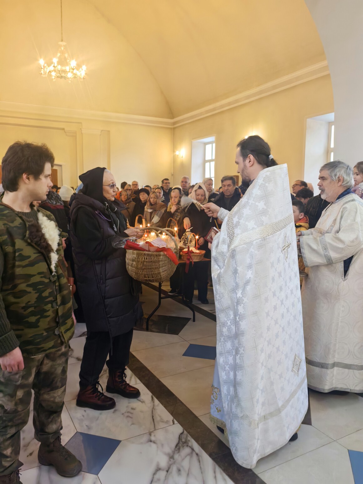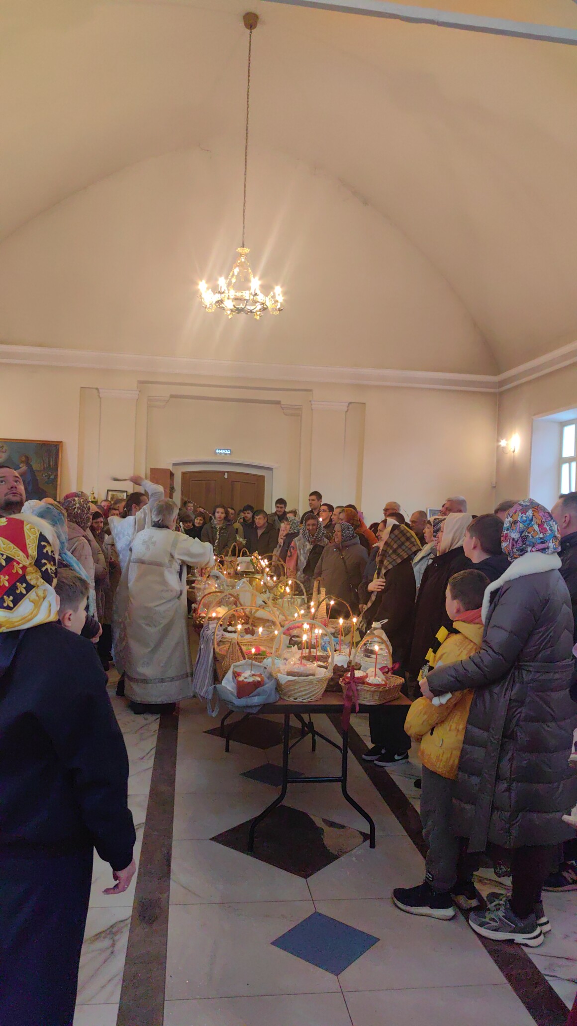 После завершения торжественного богослужения перед храмом началось традиционное освящение куличей, пасох и крашеных яиц. Отец Александр щедро окроплял святой водой пасхальные корзины прихожан, поздравляя всех с наступающим Светлым Христовым Воскресением. В воздухе смешался аромат сдобы и запах ладана, создавая ту неповторимую атмосферу, которая знакома каждому православному человеку — атмосферу последних часов ожидания Пасхальной вести.