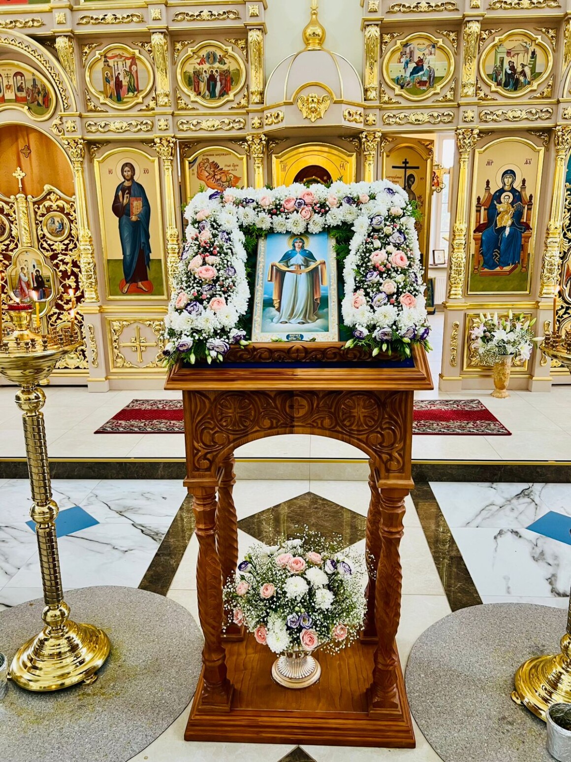 Днесь благовернии людие светло празднуем, осеняеми Твоим, Богомати, пришествием, и к Твоему взирающе пречистому образу, умильно глаголем: покрый нас честным Твоим Покровом и избави нас от всякаго зла, молящи Сына Твоего, Христа Бога нашего, спасти души наша.