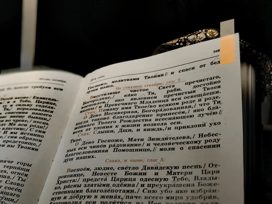 Яко прекрасная Слова палата// и Престол Светоносивый, Богородице Владычице,/ Сопрестольное Слово Отчее во Твоих ложеснах вместила еси/ и, рождши Свет незаходимый, наше омрачение просветила еси,/ лесть змиину отгнала еси́ и тле́ние потребила еси,/ жизнь вечную миру даровала еси́ Твои́м рождеством,/ врата рая отверзла еси/ и вся благая человеческому естеству даровала еси./ Но и ныне, Госпоже, Твоими молитвами/ избавляй рабы Твоя от всех бед — стихира 4 гласа на «Господи, воззвах» на Всенощном бдении.