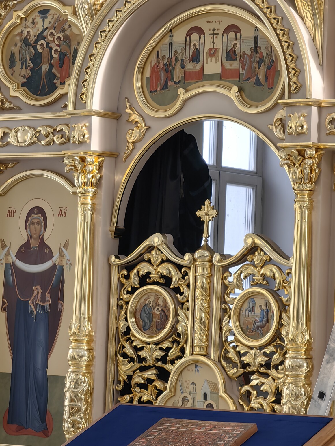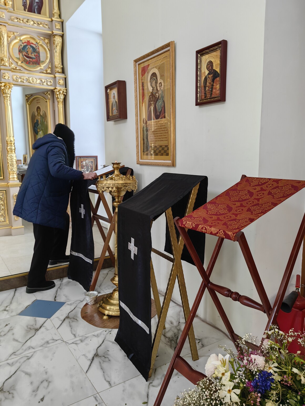 Но главные изменения произошли в алтаре и у престола. В знак наступающих дней покаяния и смирения белоснежная завеса Царских врат была сменена на черную. Храм переоблачился в строгие великопостные ризы: черные облачения напомнили всем присутствующим о грядущих сугубых молитвах и о том пути, который прошло человечество от сладости рая до горечи изгнания.